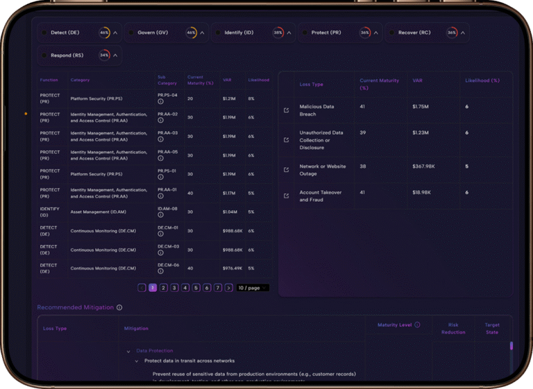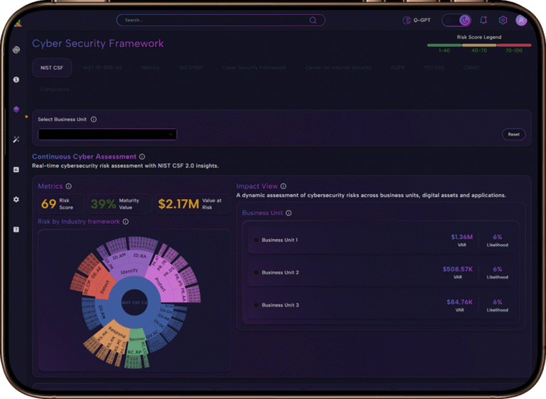 Ingests cyber and business data, aligning it to NIST, ISO, and other frameworks in real time.