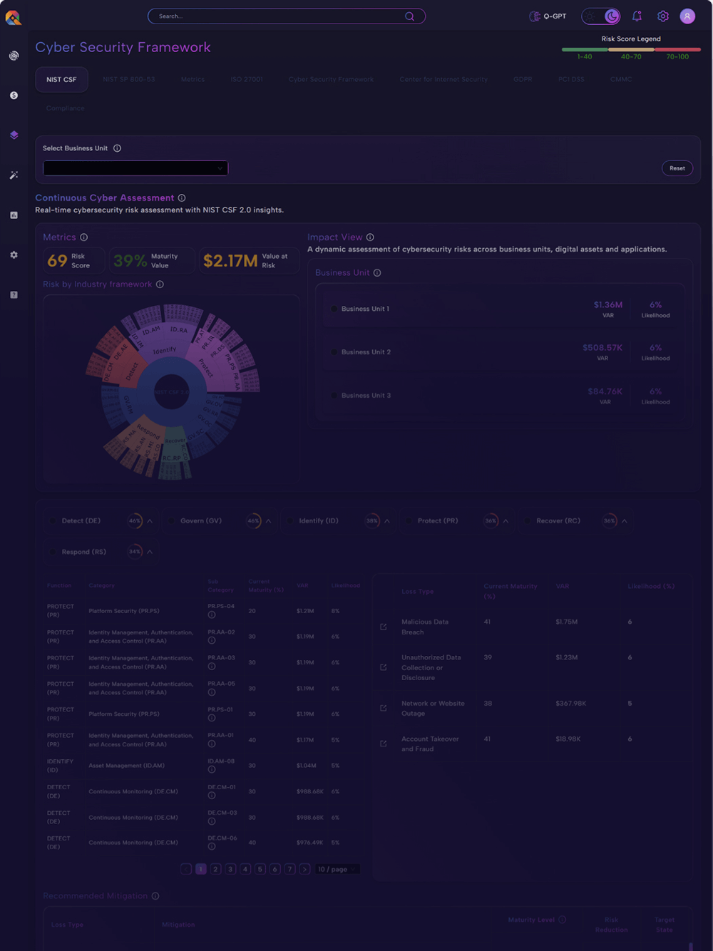 Quantara AI automates cybersecurity assessments across frameworks like NIST CSF, ISO 27001, and NIST 800-53 — quantifying how control maturity impacts enterprise risk and ROI, continuously.