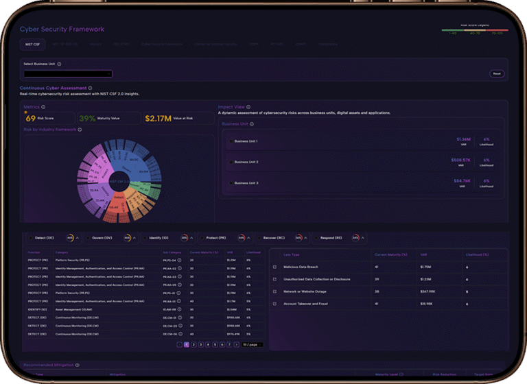 - Always-on CRQ mapped to ERM, SEC, NIST, and ISO frameworks